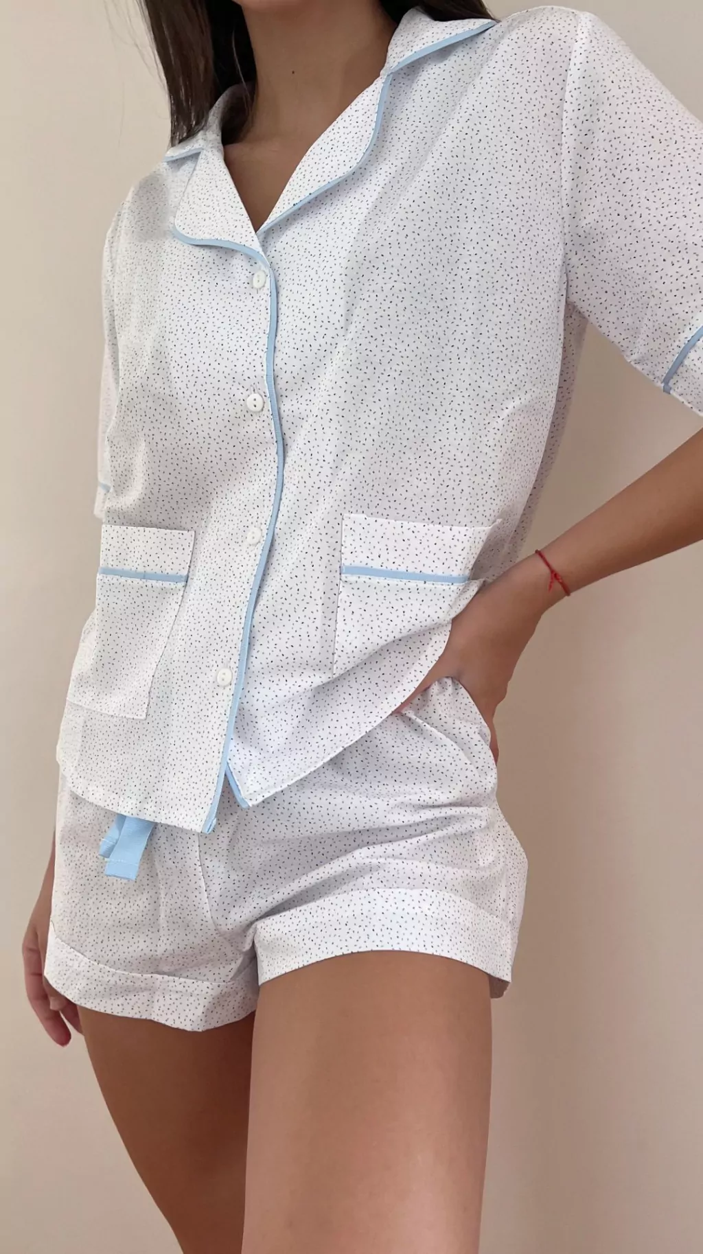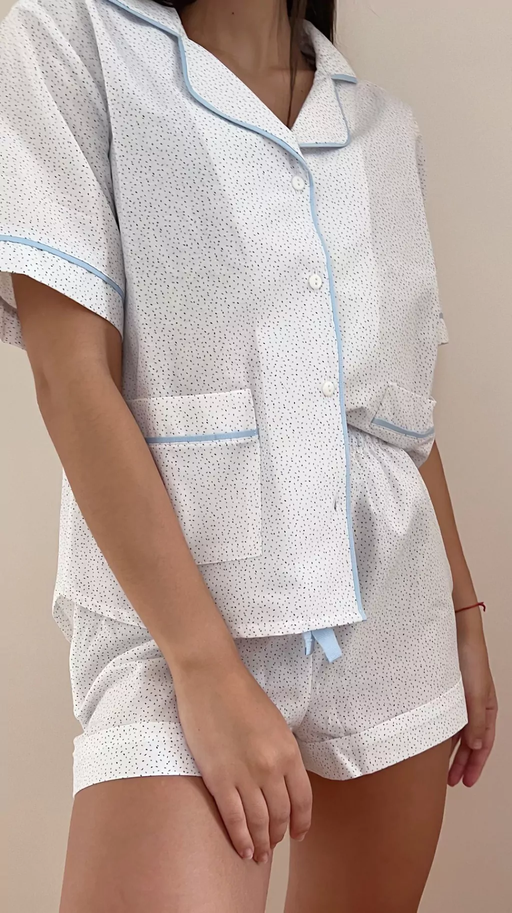 Conjunto de camisa y short con cintura elastizada y con cinta ajustable.