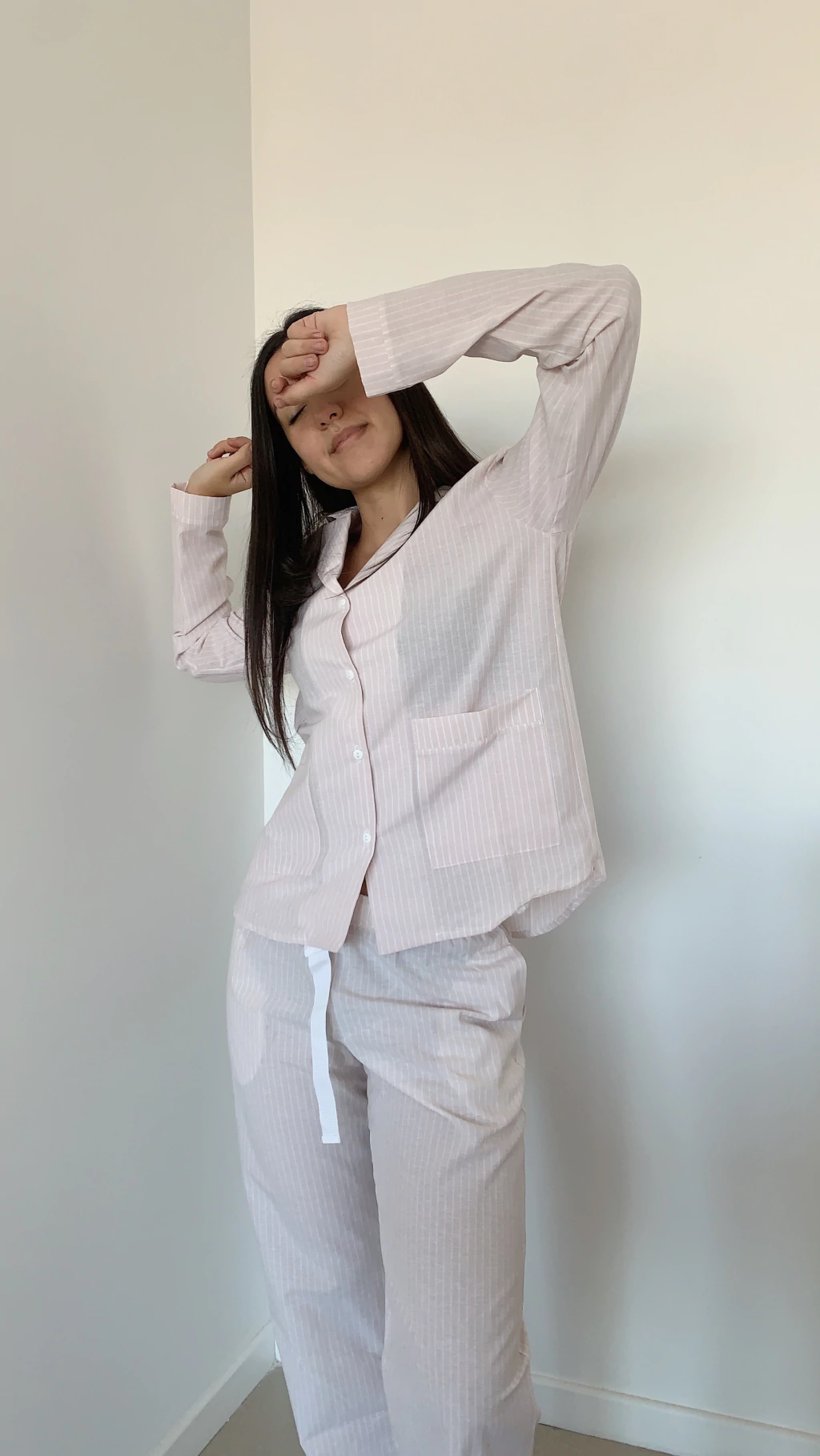 Conjunto de camisa y pantalon tiro medio con cintura elastizada, cinta ajustable y bolsillos.